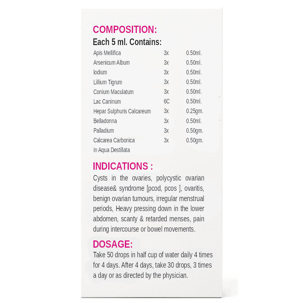 OVA CYST-X Drops is a scientifically formulated homeopathic remedy designed to manage ovarian cysts, PCOD/PCOS, and related gynecological conditions. This medicine supports healthy ovarian function and promotes hormonal balance, offering a gentle and natural approach to women's reproductive health.
